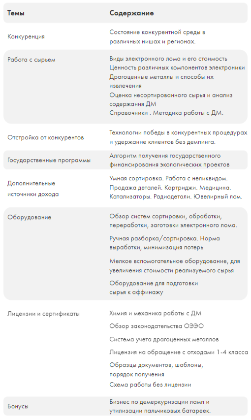 1.Дистанционный курс по созданию бизнеса по переработке и утилизации электронного лома. Курс состоит из 5 блоков рассчитанных на 5 недель. Результатом курса является внедренная Вами технология.